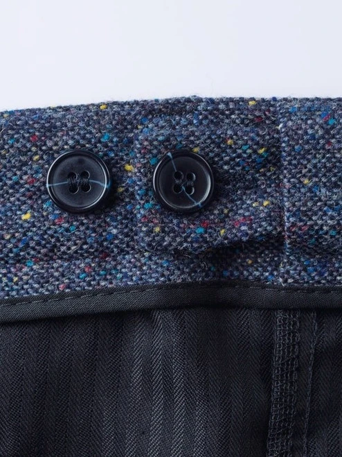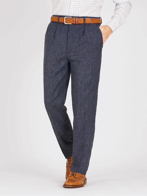 Supreme quality pure wool Donegal Tweed, woven in County Tipperary, Ireland by John Hanly & Co., a maker of fine fabrics since 1893. From a heather blue base the distinctive weave is flecked with an array of colour. For winter trouser warmth, Donegal tweed hits the nail on the head. Comfortable to wear, and the fine weave makes it flexible too. Lined to the knee for added comfort.