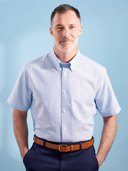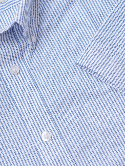 We take a beautiful quality Oxford woven cotton and cut it generously into a smart but relaxed summer shirt that you will want to wear every day! Button down collar in classic blue stripe.