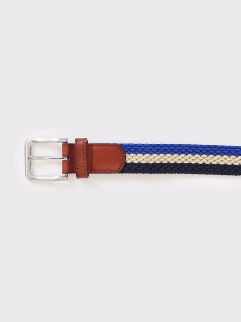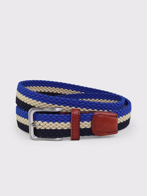A super stretchy and ever-so stylish belt. Cobalt, cream and navy stripes with tan leather ends, great with jeans or chinos. The clever woven cord design means you can fasten it anywhere for the perfect fit.