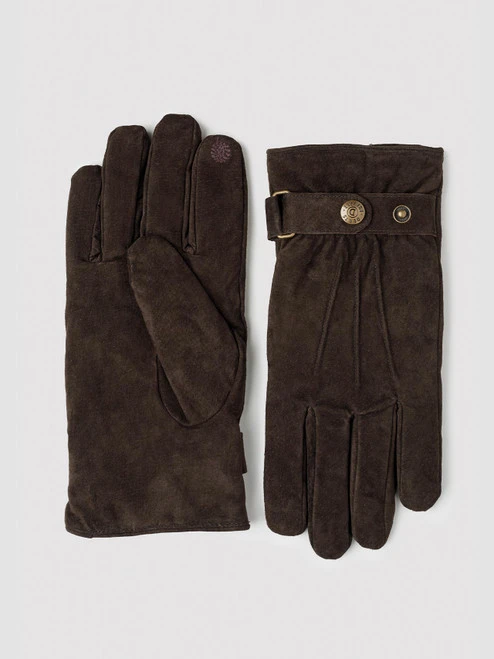 Warm, fleece-lined suede, with a stud and wrist strap for a secure fit. Water resistant, with a touch sensitive finger and thumb for your phone.
