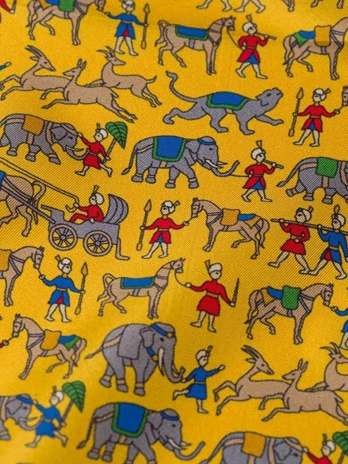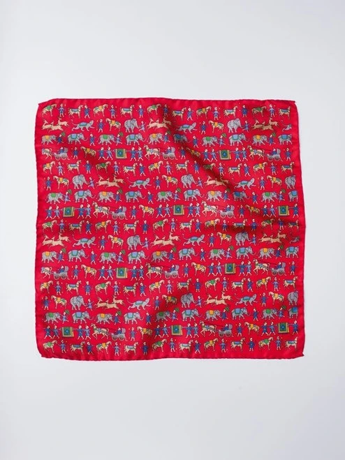 Elephants, horses and deer parade on this delightful Indian influenced pocket square.