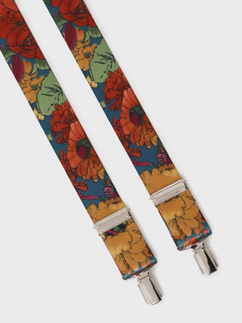 A glorious floral display in reds and gold on a deep teal background. Beautiful bold, silky braces finished with feathered nickel clips.