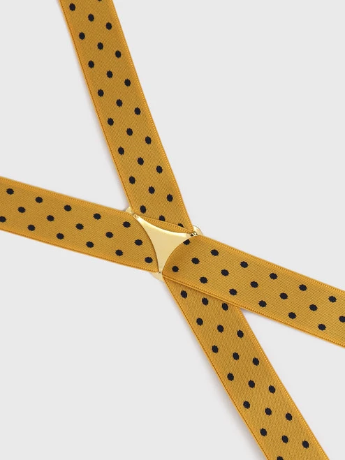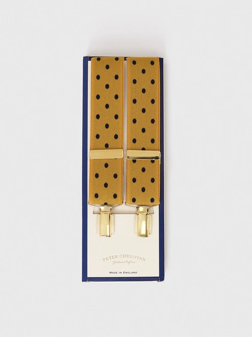 Natty gold braces with navy spots, finished with shiny gilt clips. Wear with a suit on smart days or to keep up your cords on casual ones.