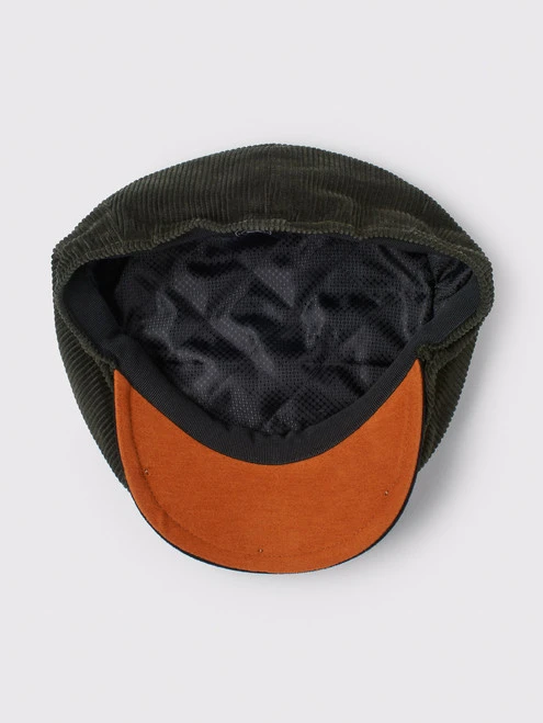 Chunky green cord with contrast moleskin details and an extra splash of colour under the peak. A cosy quilted lining to keep your head happy on cooler days.