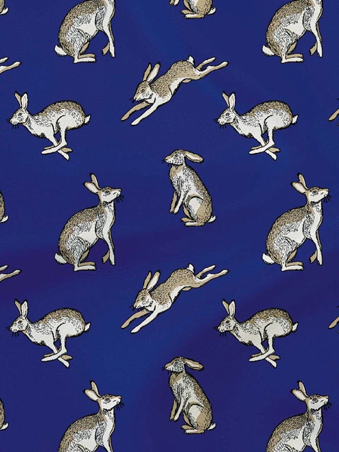 An elegant pure silk pocket square featuring beautifully illustrated hares on a bright midnight blue background. Expertly printed and finished with immaculate hand rolled edges. This exclusive design has been created in collaboration with our in-house design team and Adamley of Macclesfield, England, the oldest silk printer in the UK.