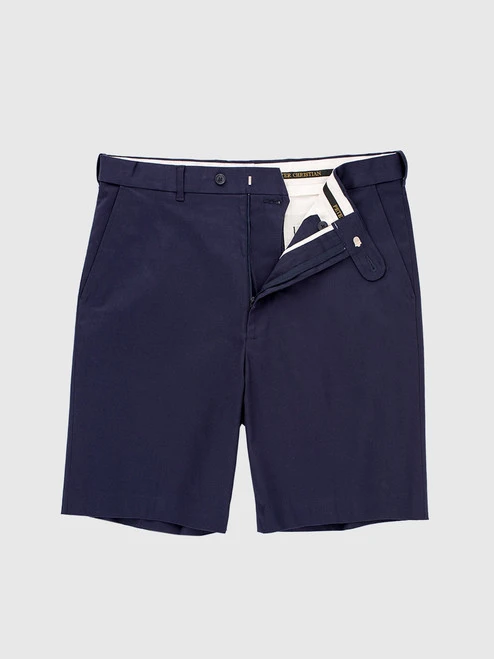 An easy-going combination of smart tailoring and stretchy comfort, cut with a slimming flat fronted waistband. Four great colours to dress your summer best. The addition of 2% elastane ensures movement is a breeze. A French bearer fastening for a secure trim front, zip fly, two deep side pockets and two buttoned back pockets – superb, stylish navy blue summer shorts.
