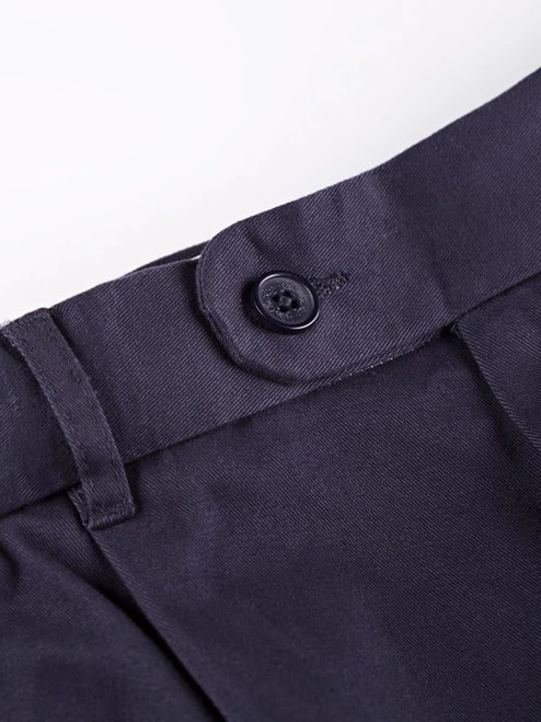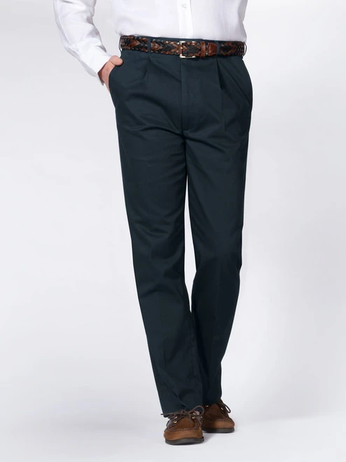 Our classic navy chino trousers: 100% cotton with single pleats at the waist, featuring our discreet expanding waistband, available in six pleasing shades. Finished to the highest standards.