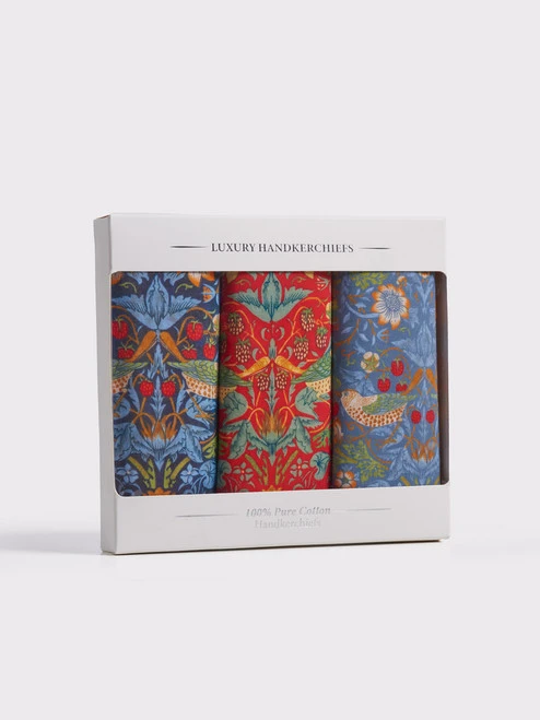 Strawberry Thief is probably William Morris’ best-known design, based on the strawberry stealing thrushes he saw in his garden. This Iconic Arts & Crafts pattern is reproduced in three colours of soft cotton handkerchiefs. Practical and comfortable for nose blowing or a bright splash of colour as a pocket square.